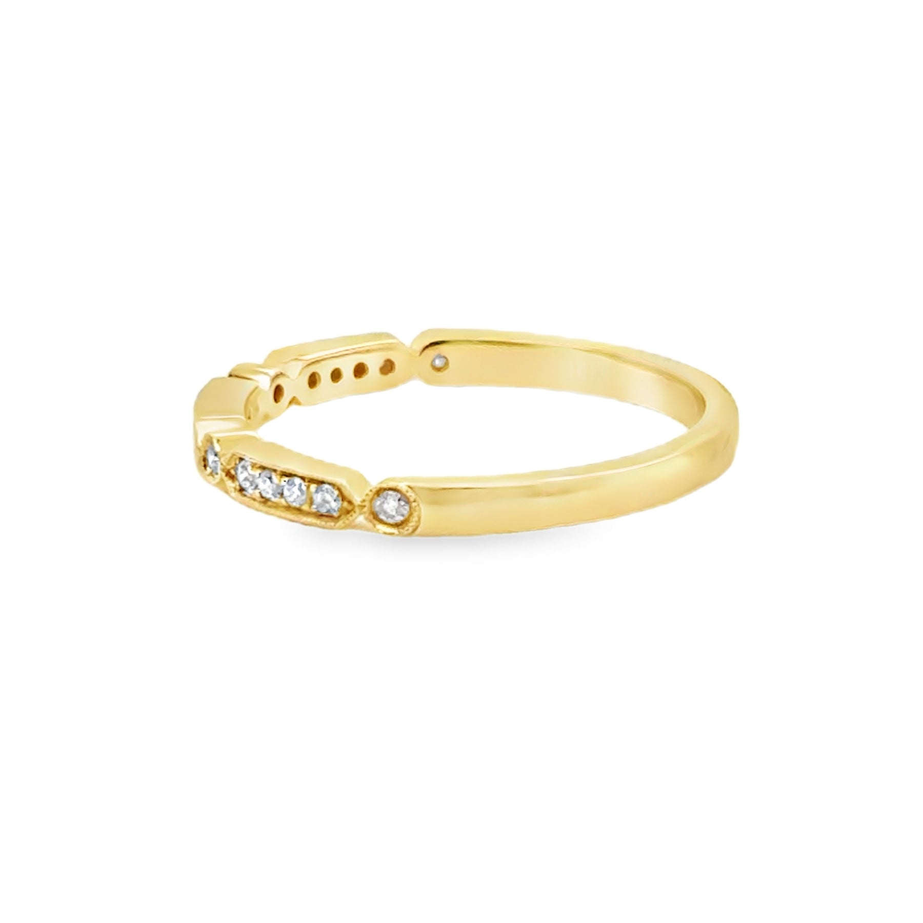 • This Art Deco-inspired band offers timeless elegance in a refined, stackable silhouette. Crafted in 14K yellow or white gold, it features a geometric design set with 16 round brilliant diamonds, totaling 0.13 carats. A beautiful choice for everyday wear, stacking, or as a vintage-style wedding band.