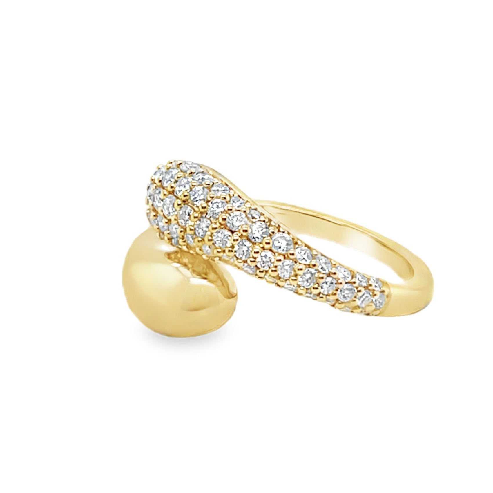 This 14-karat yellow gold pave bypass ring features 0.75 total carat weight of meticulously set diamonds, creating a sophisticated sparkle that enhances its elegant design. Sized at 6.5, the bypass style offers a modern twist on a classic silhouette, making it a refined choice for both everyday wear and special occasions. Crafted with precision, this ring balances durability with timeless beauty, ideal for those seeking expert craftsmanship and understated luxury.
