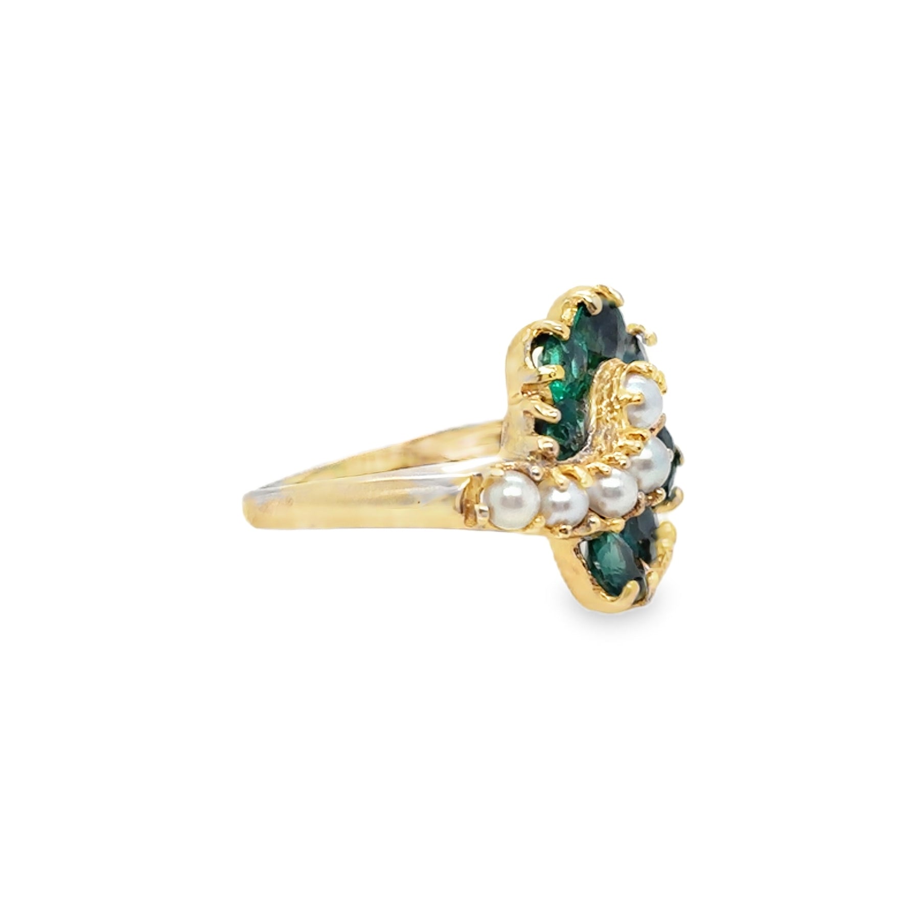 This 14K yellow gold vintage ring showcases a graceful swirl design, elegantly set with 2.02 carats total weight of genuine emeralds and pearls. The combination of vibrant emeralds and luminous pearls creates a timeless look, emphasizing sophistication and classic beauty. Perfect for collectors and connoisseurs seeking refined craftsmanship and enduring style in a distinctive piece.