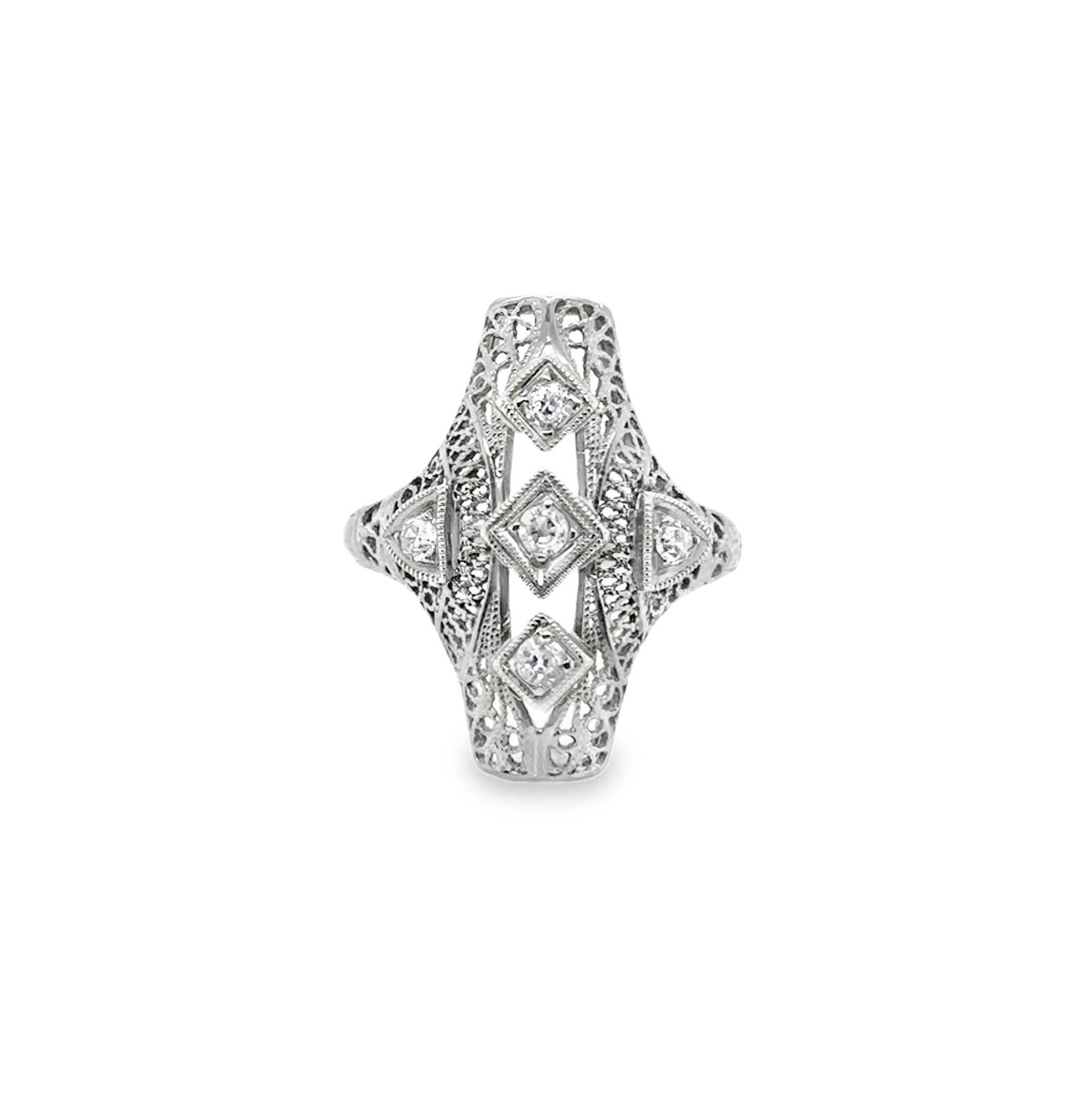 This 18KW Edwardian SI1 G Euro 0.5tdw Elongated Ring is a beautiful piece from the Edwardian period, crafted from high-quality 18K White Gold. This elegant ring features five 2mm diamonds totaling 0.5 carats (tdw), with each diamond having a weight of 0.10ct. The elongated design adds a sophisticated touch, making it a timeless choice.