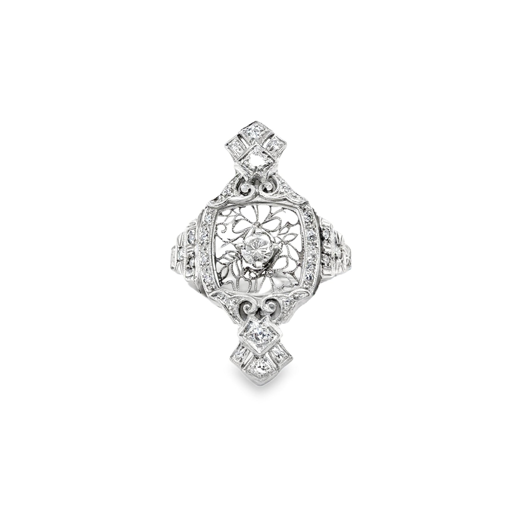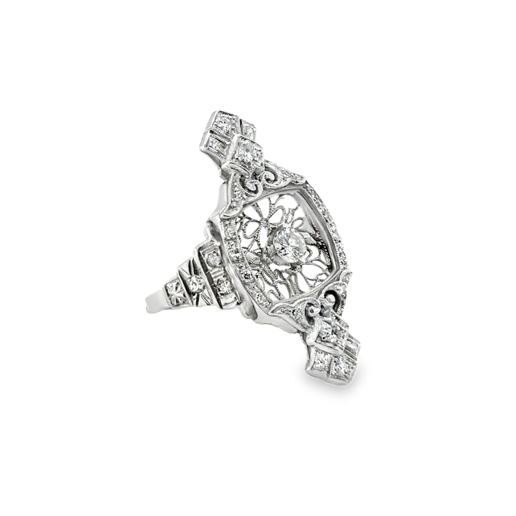 - Make a bold, timeless statement with this Platinum Diamond Art Deco Ring. Featuring intricate design elements inspired by the Art Deco era, this exquisite piece is set in luxurious platinum and adorned with sparkling diamonds. Whether you're celebrating a special occasion or simply elevating your style, this vintage-inspired ring is a radiant expression of elegance.