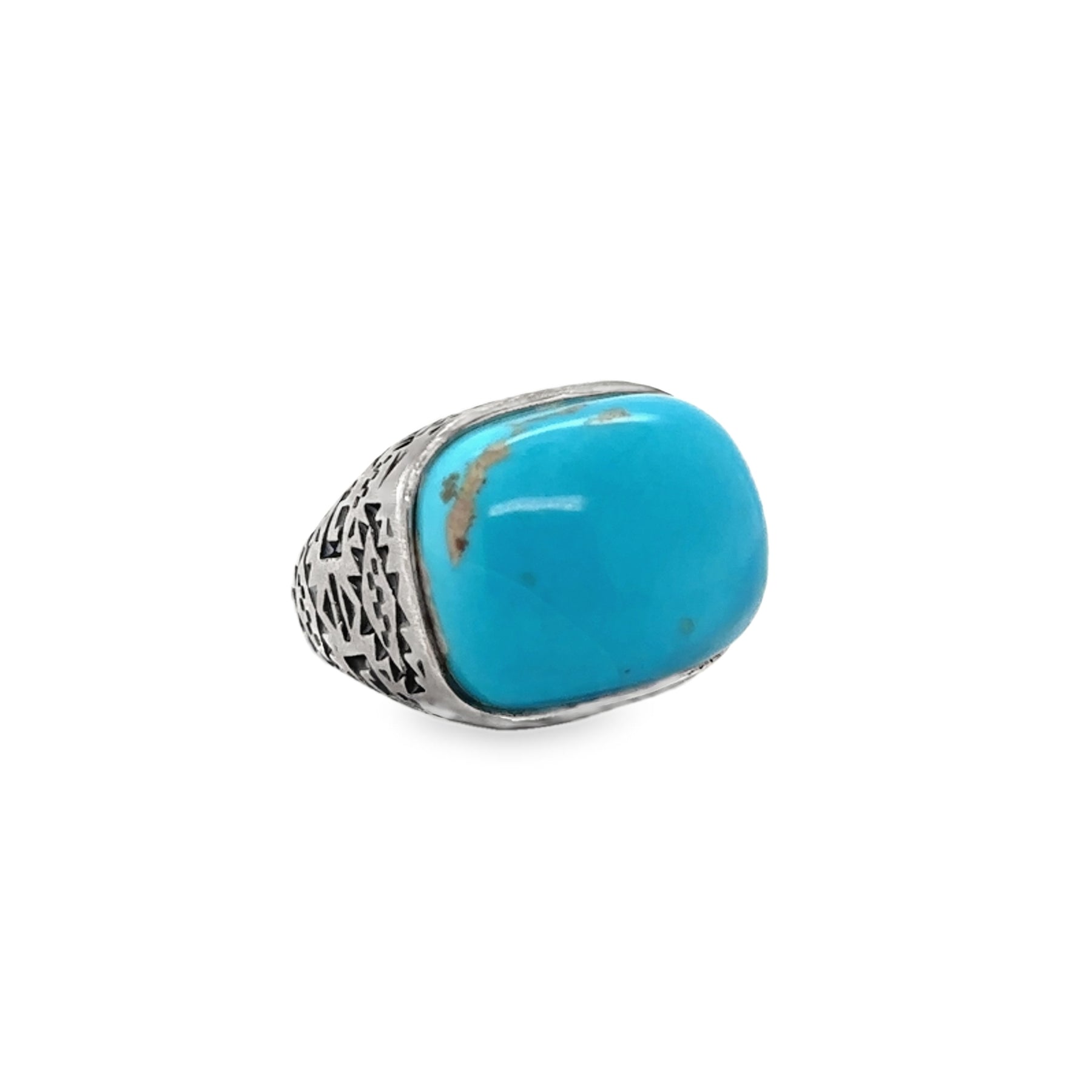 Bold and rooted in culture, the "Yaretzi" Large Aztec Ring from our Lana Lopez Collection features a striking 15x20mm natural Arizona turquoise, bezel-set in a substantial sterling silver band. Aztec-inspired motifs wrap the satin-finished shank, offering texture, meaning, and a strong visual identity. This is a western-style statement ring with timeless spirit and soulful detail.