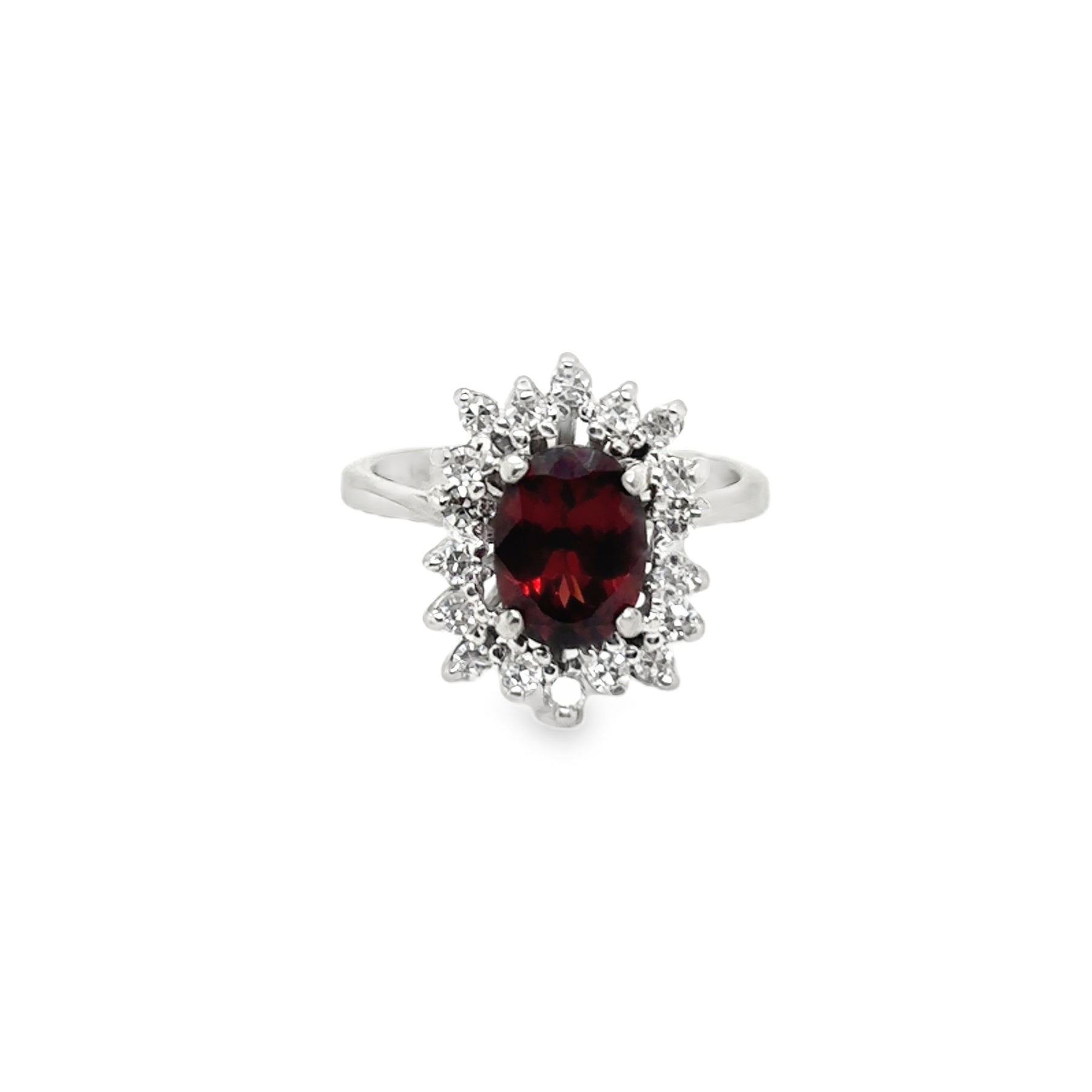 This exquisite 14K white gold ring features a stunning 1.25-carat oval Mozambique garnet, renowned for its rich, deep red hue. Accentuated by a total diamond weight of 0.28 carats, the design balances vibrant color with elegant sparkle. Expertly crafted, this piece offers both durability and timeless sophistication, making it an ideal choice for those seeking a distinctive and refined statement ring.