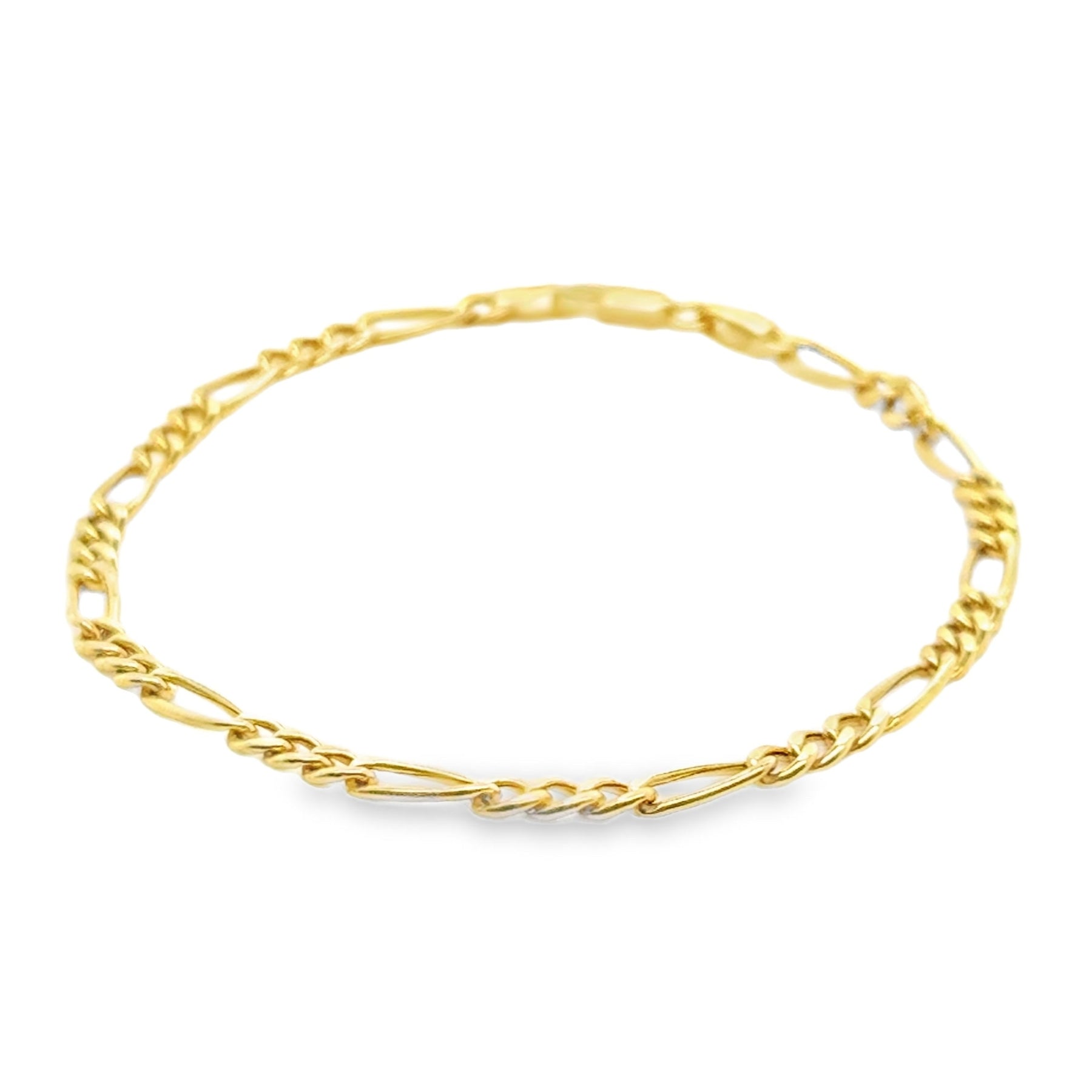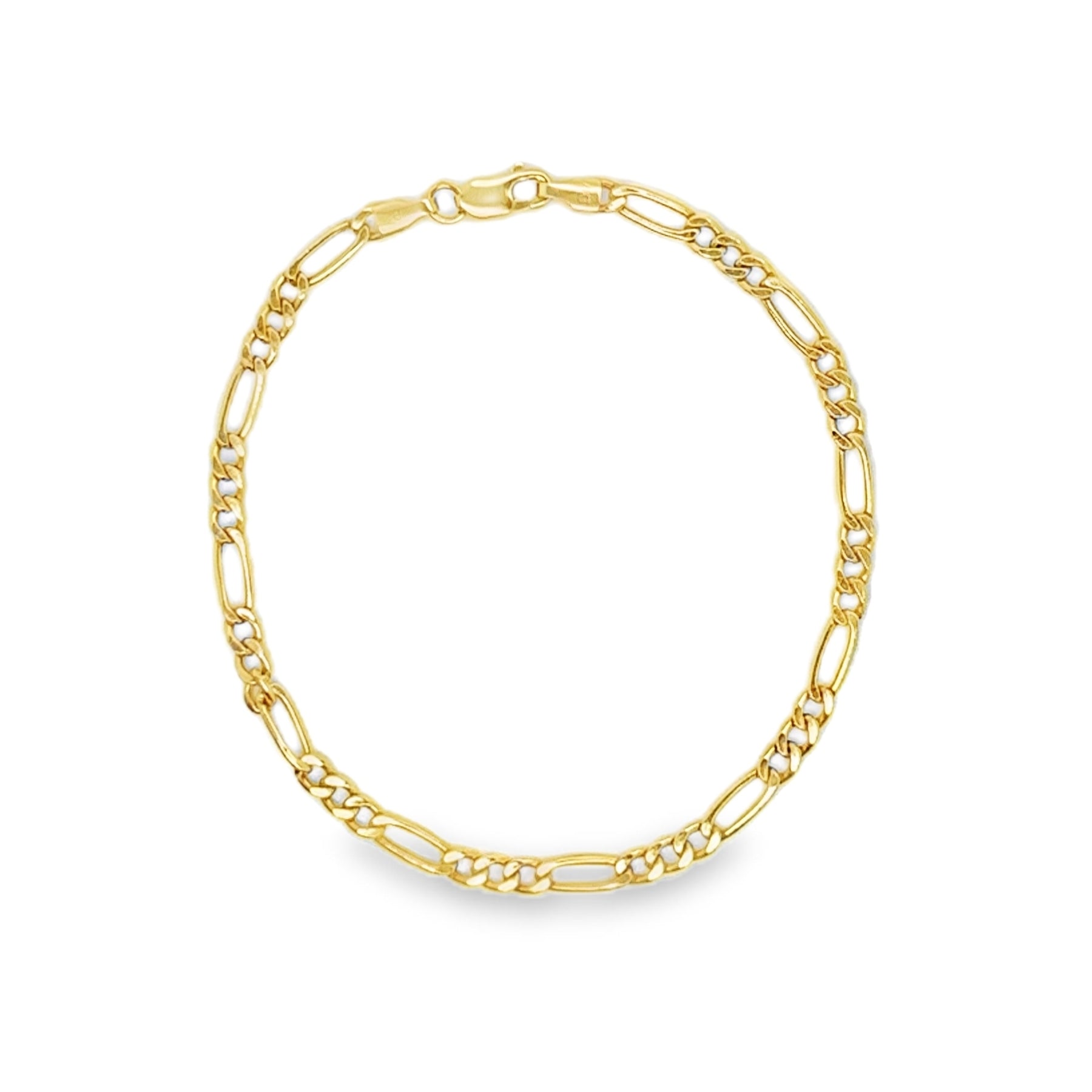 • This 14-karat yellow gold Figaro chain bracelet features a 3mm width and a 7-inch length, offering a classic and durable design. Its alternating pattern of flattened links ensures both strength and elegance, making it suitable for everyday wear or special occasions. Crafted with precision, this bracelet combines timeless style with reliable craftsmanship.