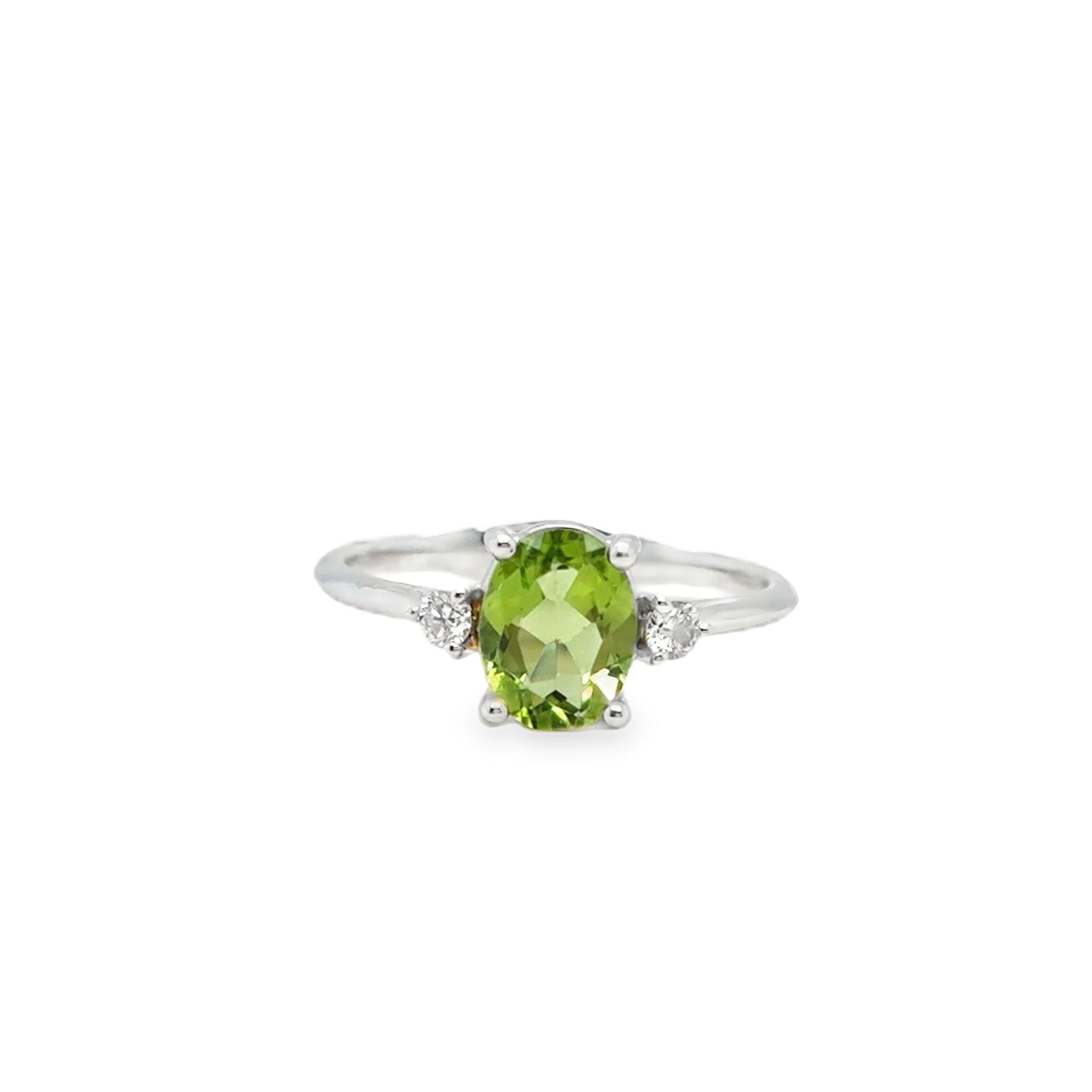 • This exquisite 18K white gold ring features a vibrant 1.28-carat peridot centerpiece, complemented by a total diamond weight of 0.10 carats. The combination highlights the peridot’s vivid green hues while adding subtle brilliance from the diamonds, making it a refined choice for those seeking elegance with a touch of color. Crafted with precision, this ring balances durability and sophistication, ideal for both everyday wear and special occasions.
