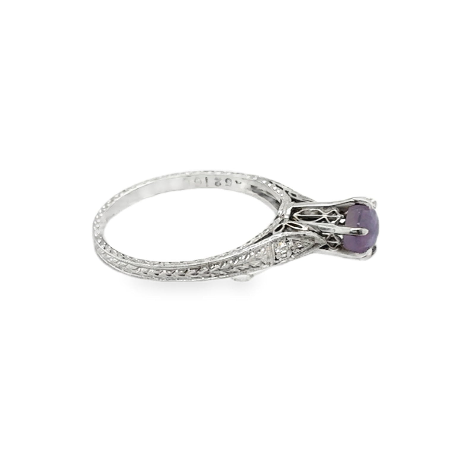 This Platinum Edwardian Star Sapphire Raised Setting Ring is a stunning piece that highlights the mesmerizing beauty of the star sapphire. The sapphire is featured in a raised setting, showcasing its unique star-like effect when viewed under light. The rich, deep color and the striking visual of the star on the gemstone make this ring a timeless and elegant addition to any jewelry collection.