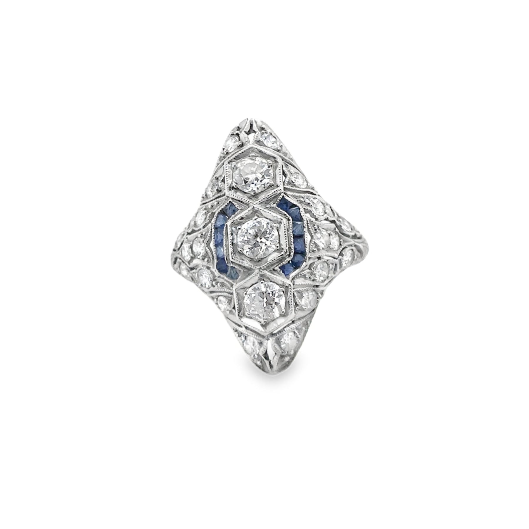 Platinum 3-Stone Diamond & Sapphire Art Deco Ring